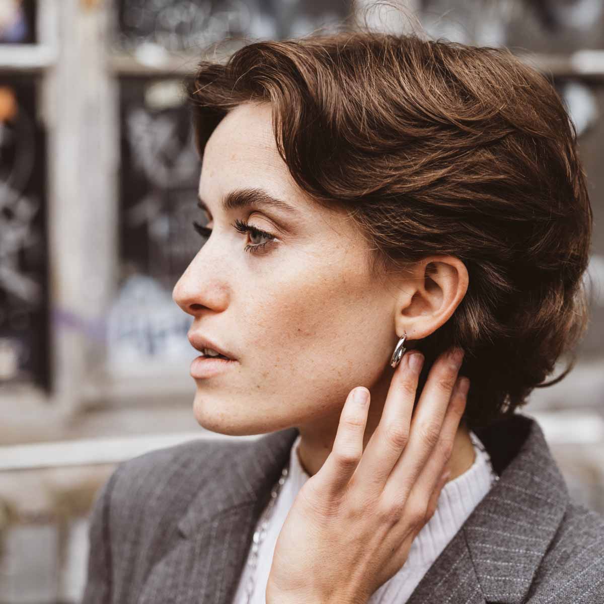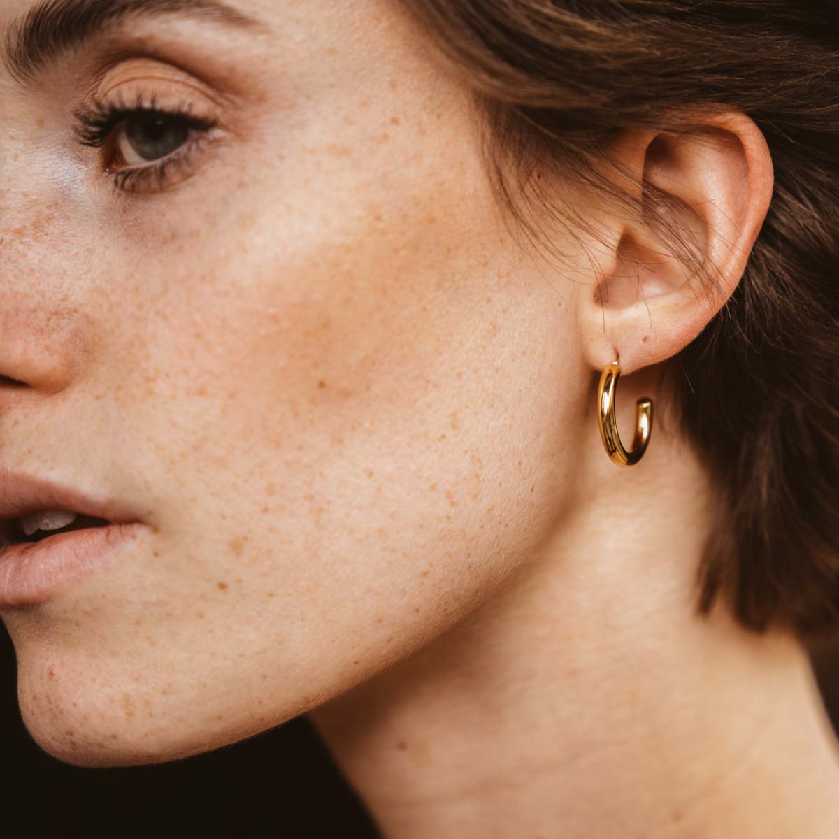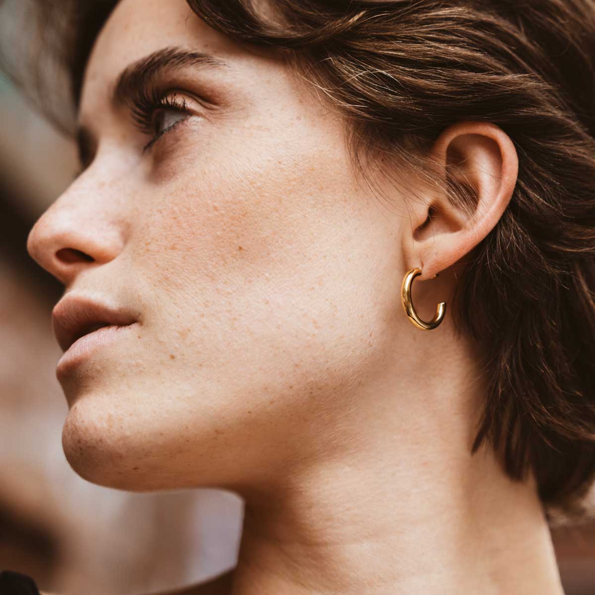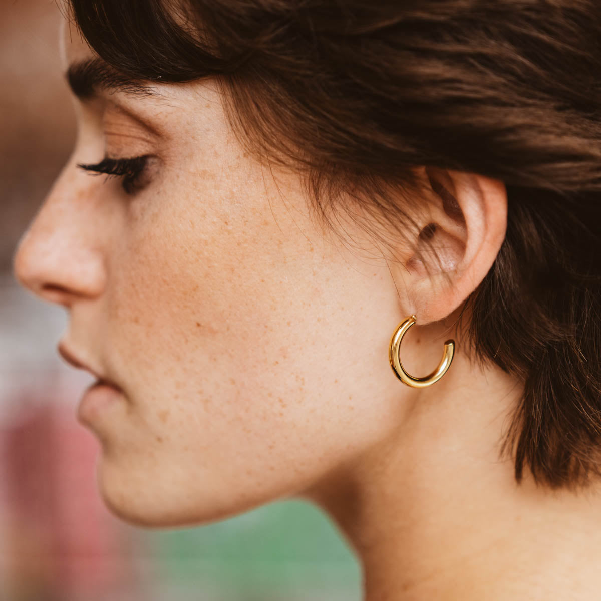 Unsere kleinen Creolen mit 20 mm Durchmesser sind dein Go-To für einen subtilen, aber stylishen Look. Dezent und vielseitig, setzen sie genau das richtige Statement – perfekt für jeden Tag und alle, die ihren Stil mühelos und authentisch leben. Ideal für ein elegantes Finish mit einer Prise Coolness!