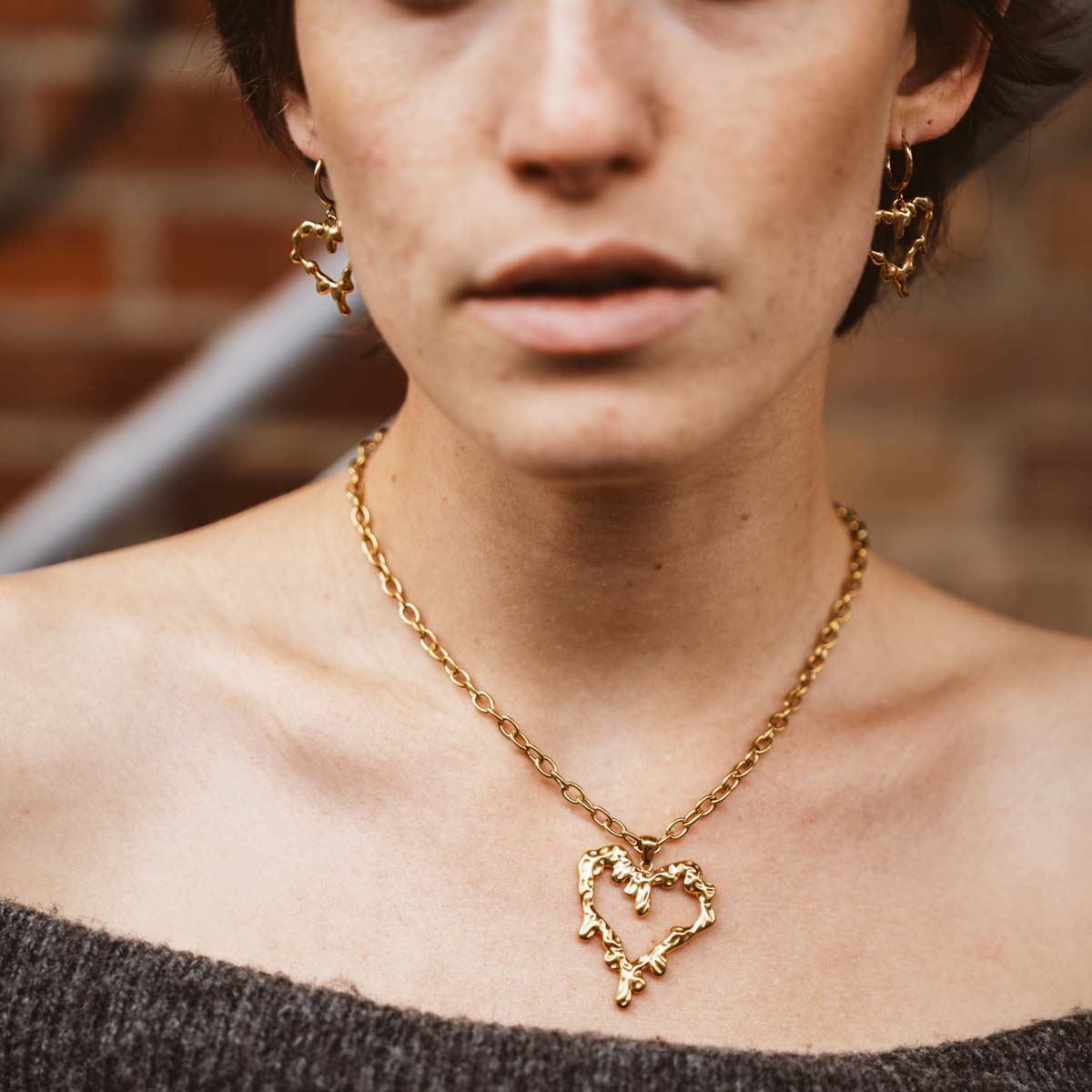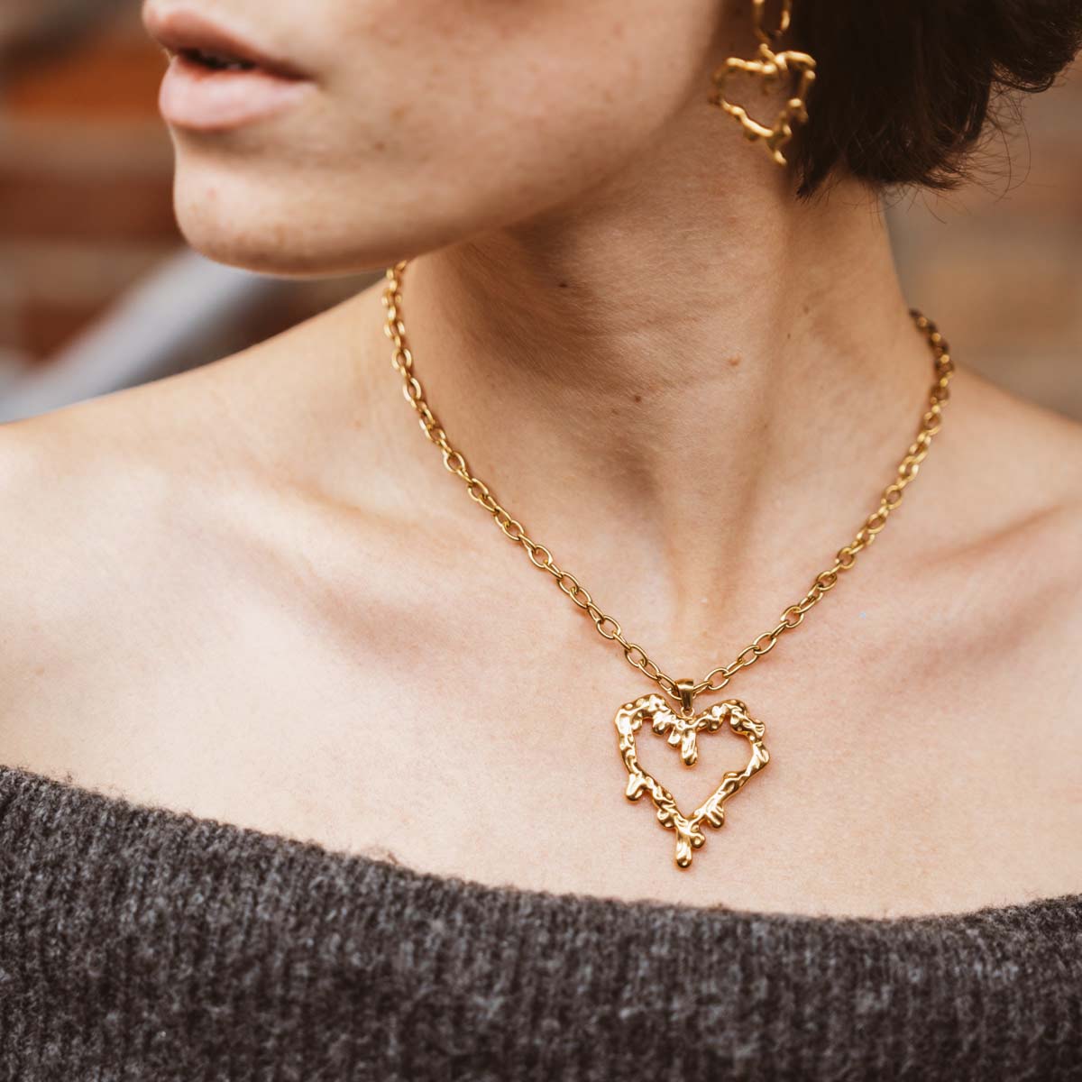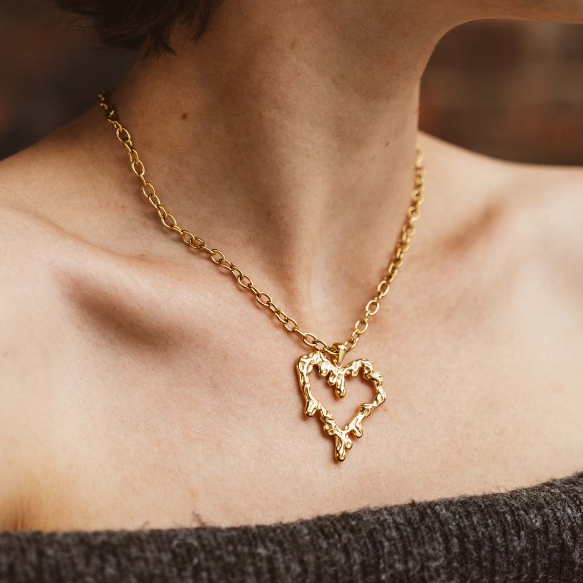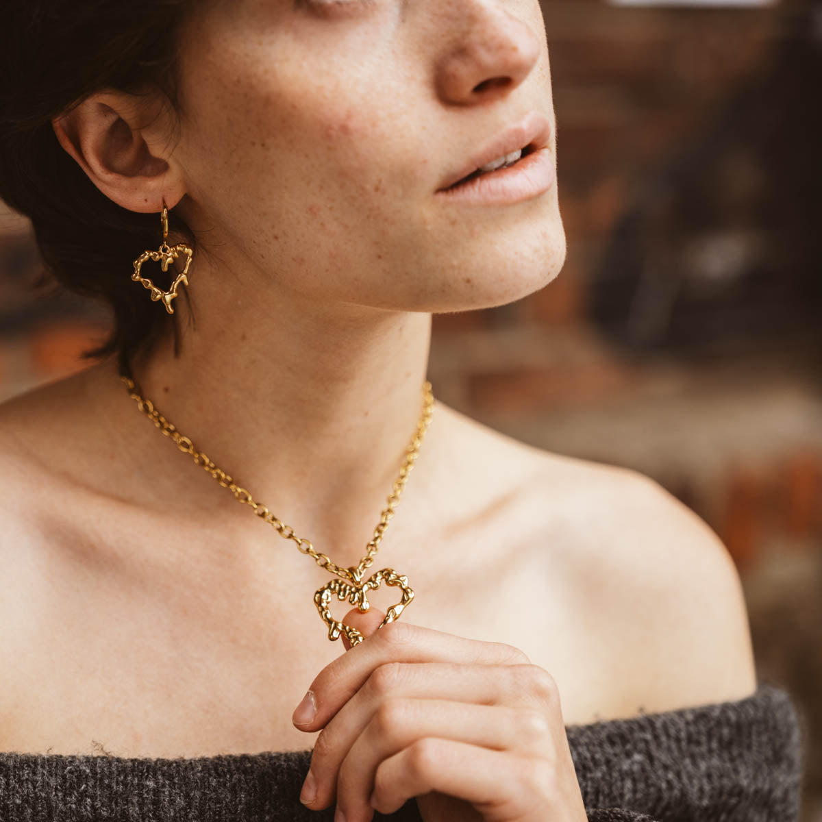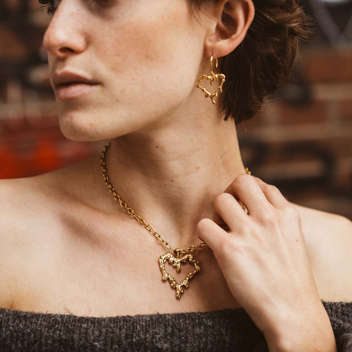 Unsere Halskette „melting Heart“ ergänzt perfekt die passenden Ohrringe und setzt ein starkes Statement. Der Anhänger in Herzform wirkt, als würde das Metall sanft schmelzen, und verleiht der Kette einen einzigartigen, künstlerischen Look. Dieses Schmuckstück ist für alle, die ihre emotionale Seite mit einem rebellischen Twist zeigen möchten – ein Herz, das buchstäblich in Bewegung ist.